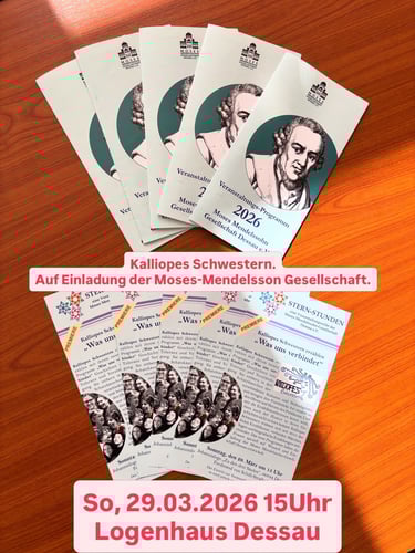 2026 ab 15Uhr ist die Moses-Mendelssohn-Gesellschaft mit einer öffentlichen Veranstaltung im Rahmen der Veranstaltungsreihe „Sternstunden“ im Logenhaus Dessau. Die Erzählkünstlerinnen „Kalliopes Schwestern“ werden ihr Programm „Was uns verbindet“ auf die Bühne bringen. „Was uns verbindet“: