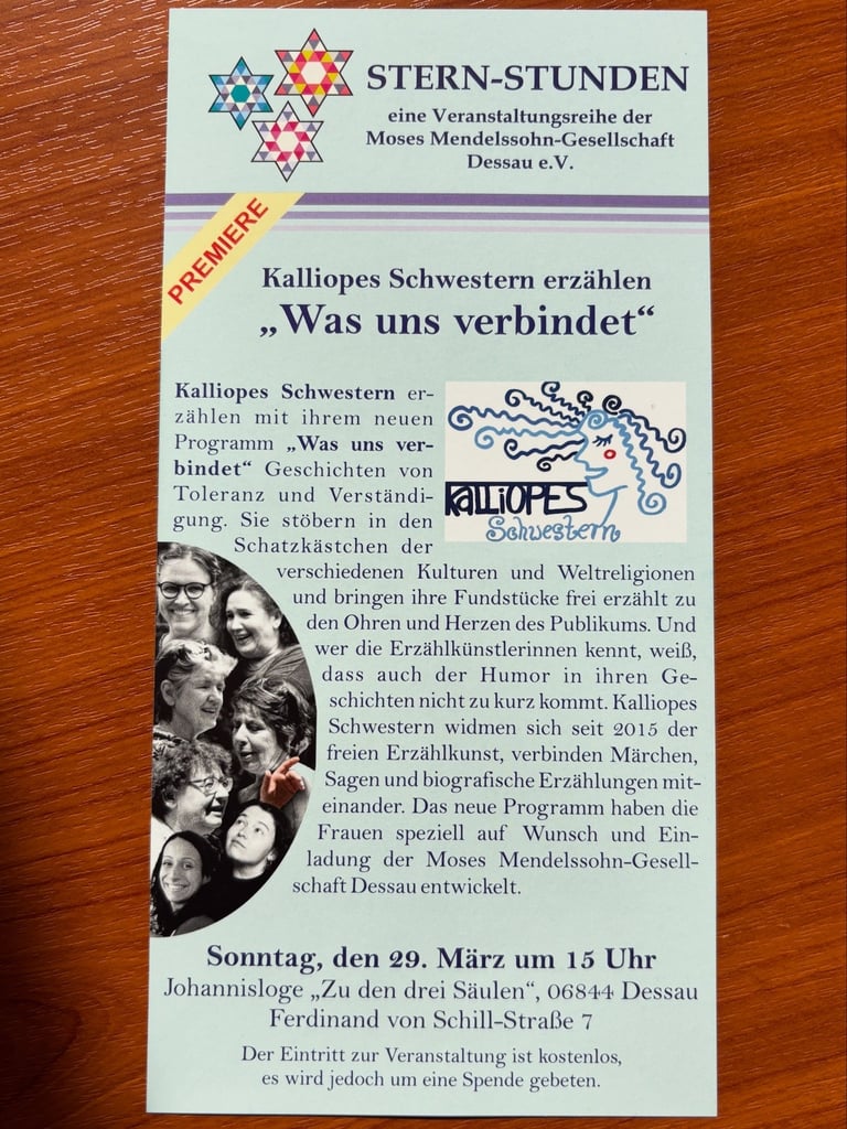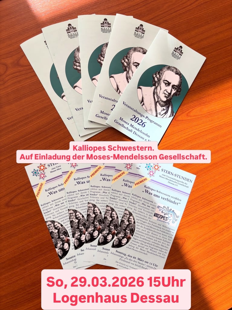 Am Sonntag, den 29. März 2026 ab 15Uhr ist die Moses-Mendelssohn- Gesellschaft mit einer öffentlichen Veranstaltung im Rahmen der Veranstaltungsreihe „Sternstunden“ im Logenhaus Dessau. Die Erzählkünstlerinnen „Kalliopes Schwestern“ werden ihr Programm „Was uns verbindet“ auf die Bühne bringen.