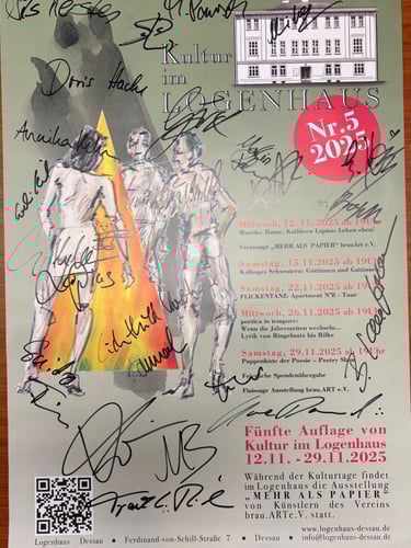 Unser herzlicher Dank gilt allen Mitwirkenden auf, vor und hinter der Bühne sowie allen Gästen, die diese Kulturtage zu einem besonderen Erlebnis gemacht haben. Gemeinsam konnten wir eine Spendensumme von 3.095 Euro zugunsten der Bahnhofsmission Dessau sammeln – ein Ergebnis, das uns überwältigt und zeigt, wie stark Kunst und Gemeinschaft wirken können.